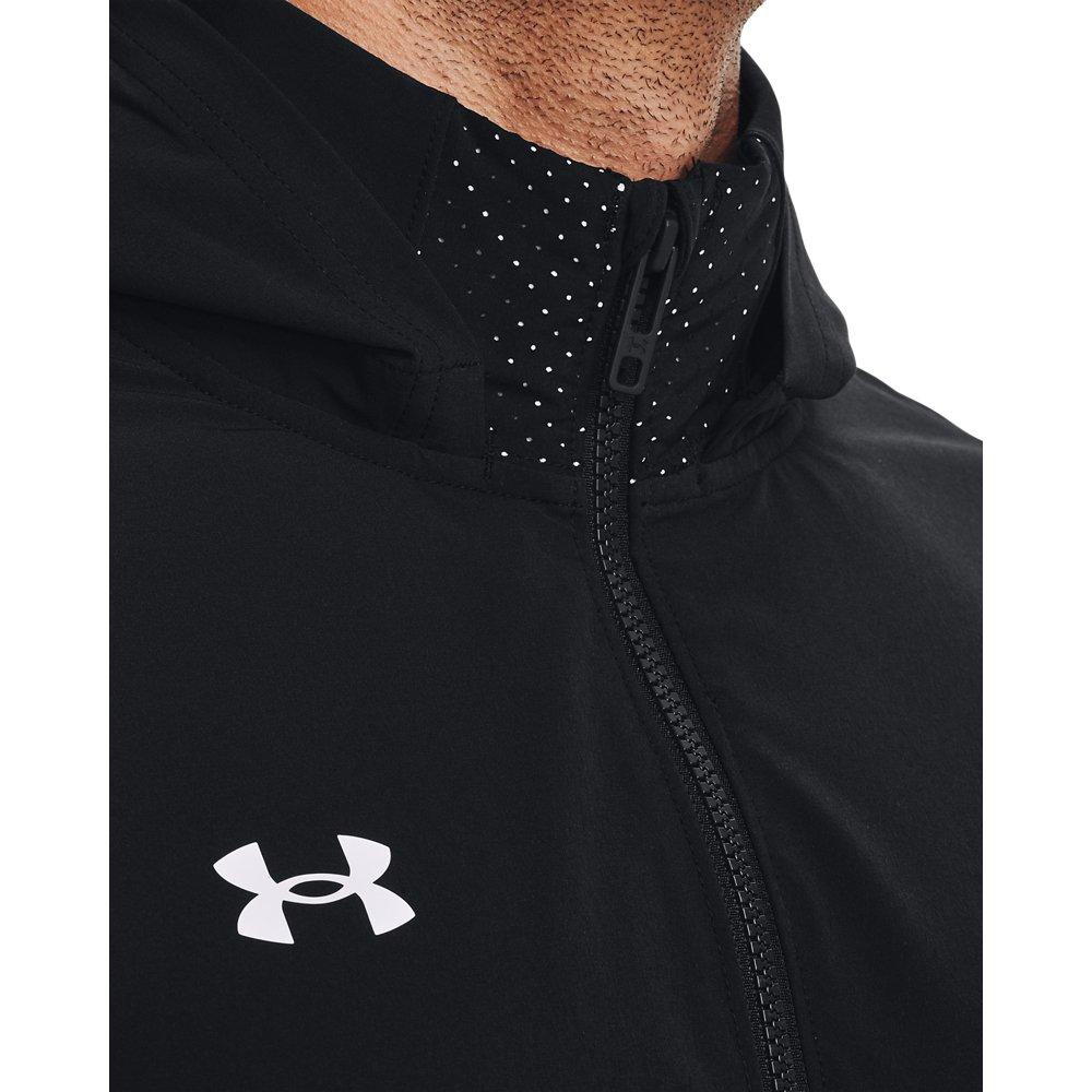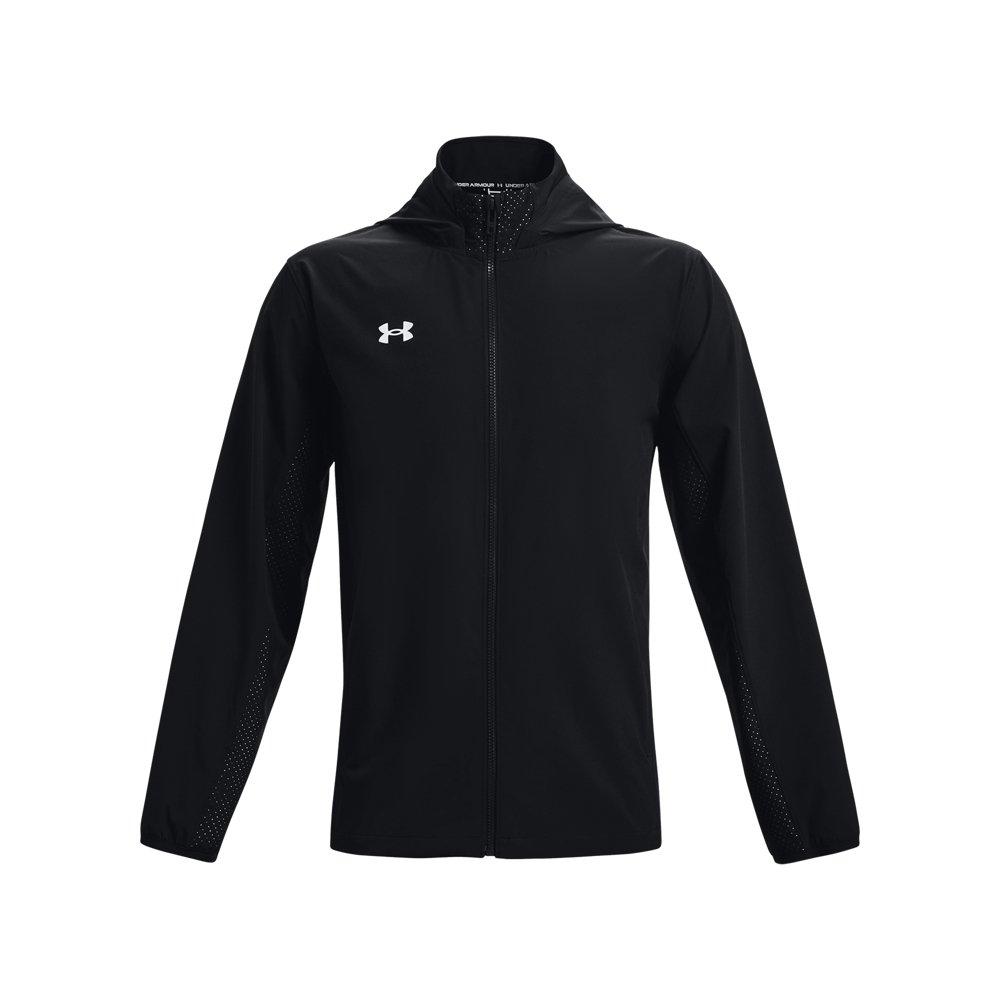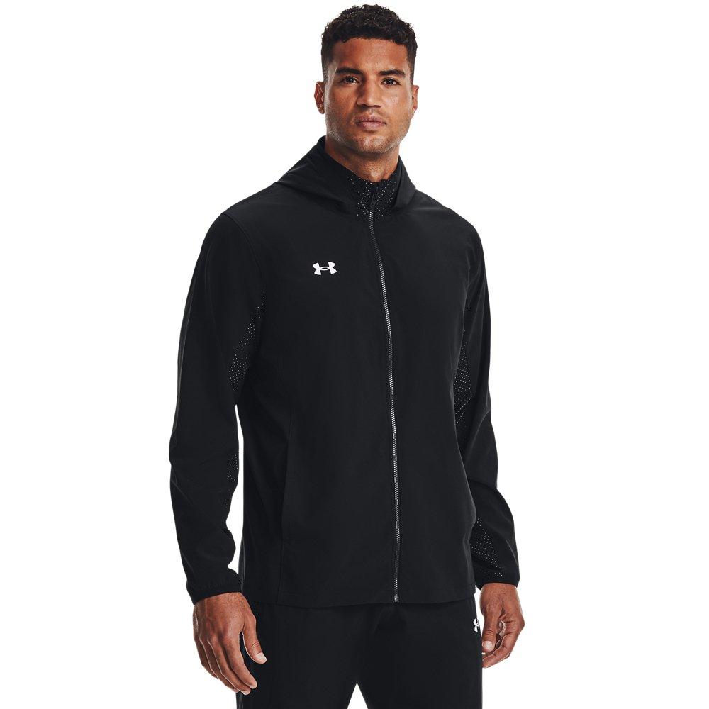 The Under Armour Men's Squad 3.0 Warm-Up Full-Zip Jacket is designed to keep you comfortable and dry during your workouts. Featuring UA Storm technology, this jacket repels water while maintaining breathability. Its lightweight stretch-woven fabric ensures durability and comfort, while perforated overlay panels enhance breathability. The jacket also includes a packable hood that can be tucked into the back collar and open hand pockets for convenience.