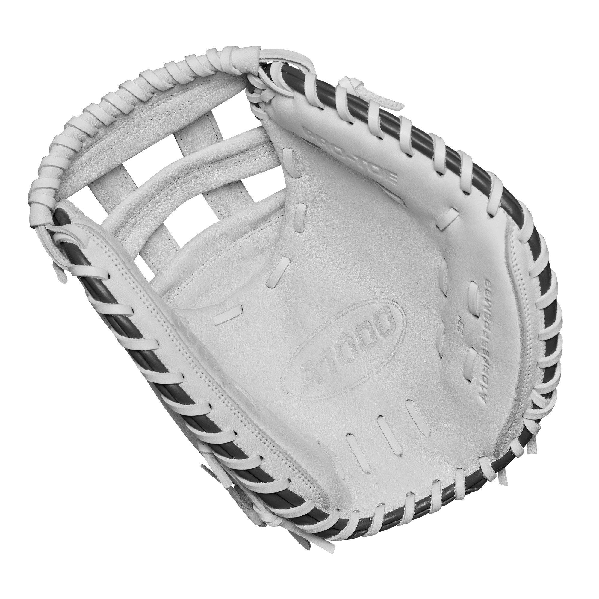 Steal strikes with ease using the Wilson 2025 A1000 Fastpitch Catchers Mitt, Right Hand Throw. This 33” catcher's mitt features a White Full Grain leather palm that is both soft and durable, making it ready for the field and capable of enduring numerous bullpen sessions and in-game innings. With its 33” circumference, thin toe pads, and Dual Post Web, this glove allows for precise control of the strike zone and helps set targets for your pitcher. Handcrafted in Wilson's A2000 factory, the A1000 CM33's Full Grain leather molds to a player's hand over time, enhancing comfort while calling the game.