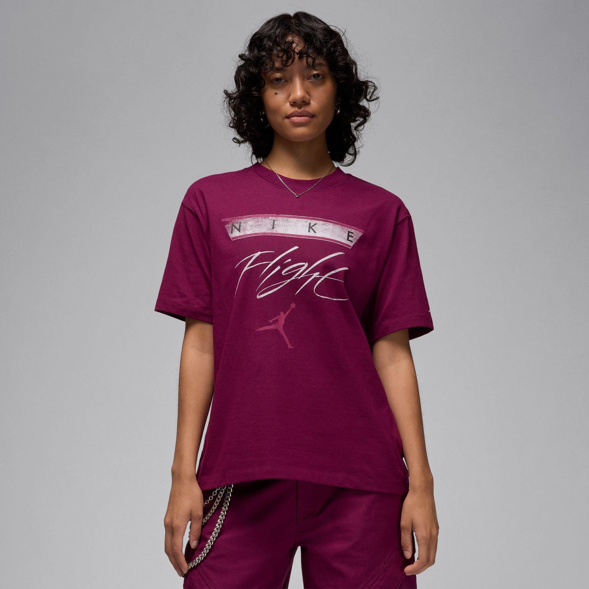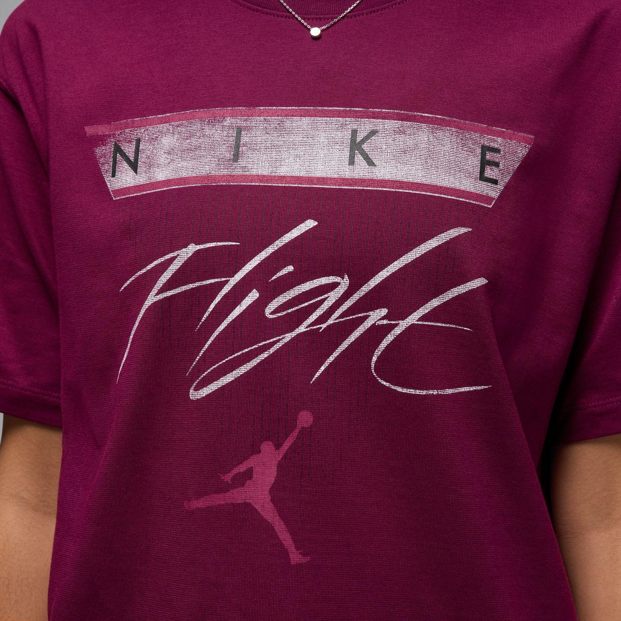 Embrace the timeless appeal of the Jordan Flight Heritage Women's Graphic T-Shirt. This tee boasts a relaxed, slightly boxy cut and features a classic graphic that effortlessly communicates your style. Made from 100% cotton, it offers a comfortable fit for all-day wear. Plus, it's machine washable for easy care. The Jumpman screen print on the sleeve adds a touch of iconic flair to this staple piece. Imported.